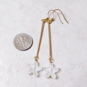 Lightweight dangle earrings - featuring a frosted glass sea star or starfish in a low key, dainty, minimalist way. Gold plated hardware + durable brass earwires.