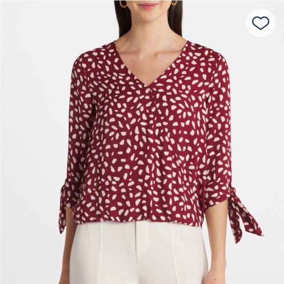 This stylish blouse features a flattering V-neckline and a relaxed fit for ultimate comfort. The lovely burgundy and white color scheme is complemented by a chic tie front detail, making it perfect for casual outings.