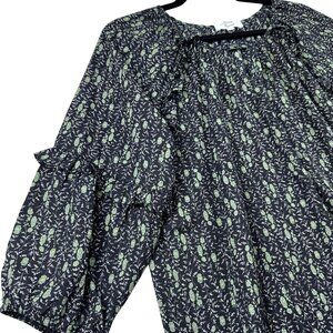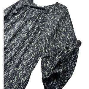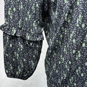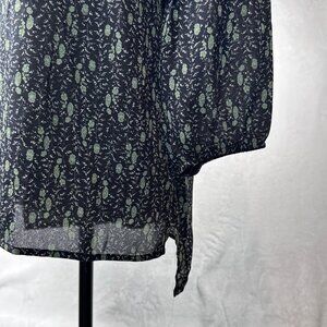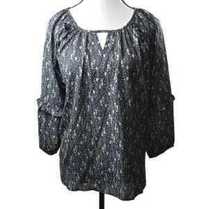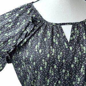Beacon Apparel Black Green Floral Blouse Sz M 3/4 Sleeves Keyhole Flowy Fairy