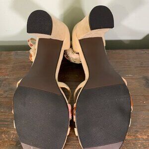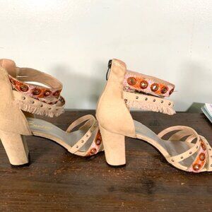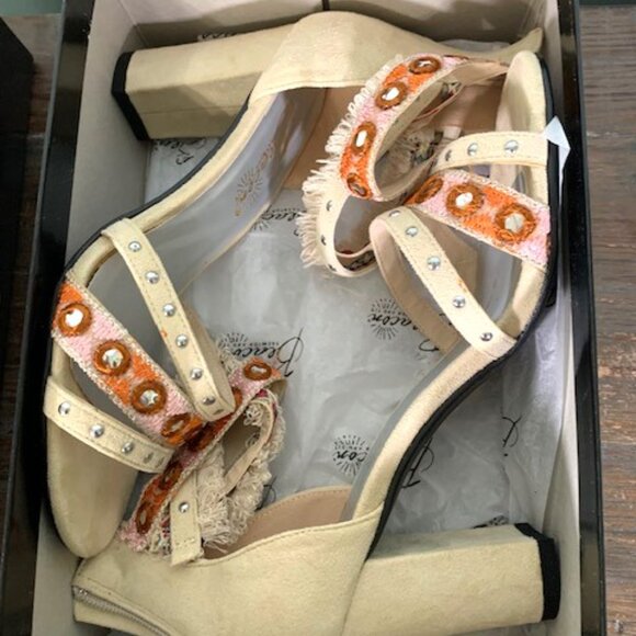Cute light tan Rio Dress sandles with three ankles and three foot straps that have colored thread and rhinestones, color on the inside of one shoe is not a stain, it is part of the material. Size 9.5W. Measures approx. 7.5"H total and 3.5" heel. New in box. White spots/lines are glare from lights. *Color may vary slightly from pictures. Please view all photos carefully for complete description.