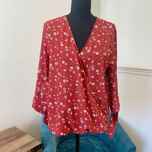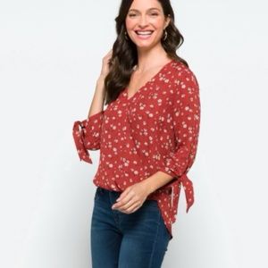 Beacon West K Allan Surplice Tie Sleeve High-Low Blouse, Size M, EUC. Blouse has functional ties for unique look, V neckline and a tack at the bust to ensure secure fit. Orange Red color with floral print. Ruching at waist for flattering fit. 100% polyester. Measures: 20" arm pit to arm pit and 27" length.