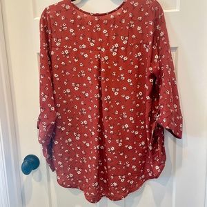 Beacon Hi-Low Tie Sleeve Blouse, M, EUC, Orange Red with floral print