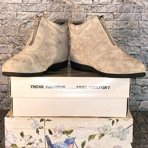 Beacon suede ankle booties in a pretty fawn color with anti shock non slip rubber soles. You will receive in the original box and packing. Worn a couple of times with very light wear. Fantastic pre-owned condition on the leather uppers and front zip closures.