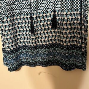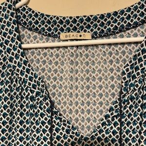 Beacon sleeveless top . Geometric blue and green pattern with coordinating strip on bottom hem . Cord tie center front. Sz2x