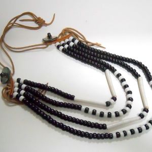 A decorative Native Look, Black and White Beaded Necklace, Strung on a Genune Leather Cord, features a leather tie closure. There are also two large Abolone Shell Discs on each side. The black and white beads are round ceramic and the long beads in the center are tubular shaped shell.