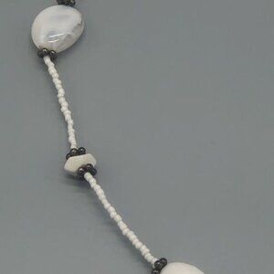 This elegant necklace features black and white marbled beads in varying sizes, perfect for adding a touch of sophistication to any outfit. A unique piece of costume jewelry suitable for any occasion.