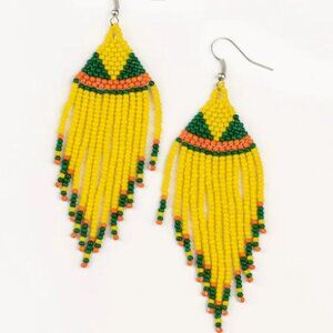 Strands of yellow, green, and orange seed beads colorfully weave into a vivaciously beaded fringe. Earring attaches to a standard fishhook fitting. Sold as one pair of earrings.