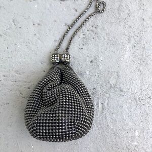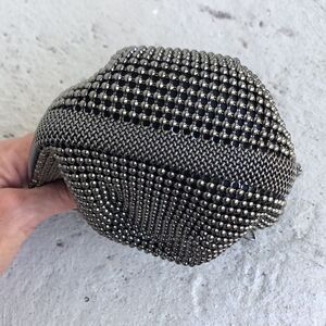 Gun metal beading like mesh with rhinestones on the magnetic closure. Also has a zip closure. Lining inside is stuffed so that the bag has a puffy shape. Super sweet open is approximately 7 inches zipped open. The bag measures across the top 7 by 5.5