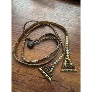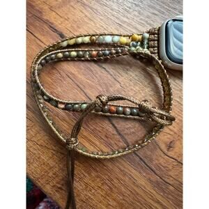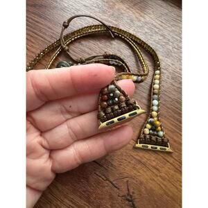 Excellent preowned condition. This is a beautiful brown gray and tan with a bit of gold sparkle beaded bracelet for an Apple Watch. It wraps around and has an adjustable button closure. Each end has a gold tone clip that fits into the watch. The bracelet measures approximately 20” long for each side. Comes in a small pouch.