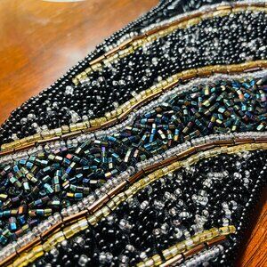 A unique, eye-catching accessory to spice up any wardrobe. Authentic 1970's adjustable beaded belt. This statement piece adds style and flair to any ensemble. Perfect for classy functions and also "just-for-fun" retro costumes. Polyester and rayon fabric. Can be hand cleaned in cool water with gentle detergent. Hang to dry.