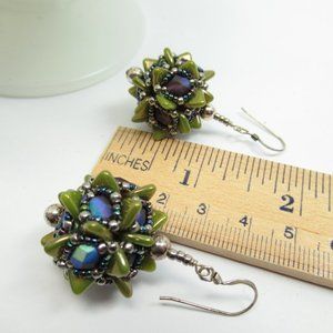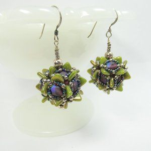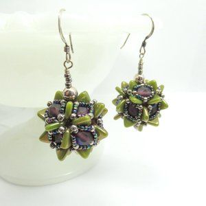 This listing is for the handwoven beaded bead earrings pictured. They are new and have never been worn. They were made by me from seed beads, faceted Czech glass, and shaped Czech glass beads. They are a fun green and purple color. They hang from Sterling silver 925 earwires. I made them for myself but have never actually worn them.