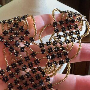 This handcrafted black and gold beaded bib necklace features intricate seed beadwork in an open lattice pattern. Designed in a flattering V shape, it drapes beautifully across the collarbone and adds bold texture to any outfit. Perfect for dressing up a simple top or layering with boho looks.