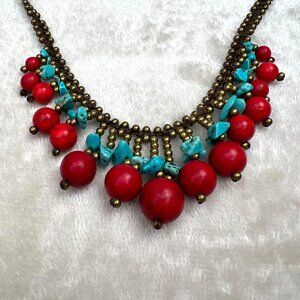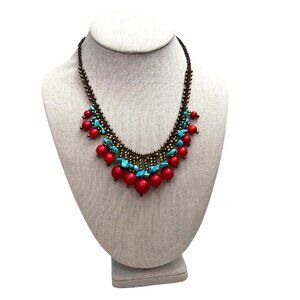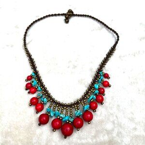 Beaded statement necklace in shades of red and turquoise. Bauble beads, faux turquoise chips, gold beads, brown braided rope with cute bell toggle closure. Good condition. Measures approx 18" long.