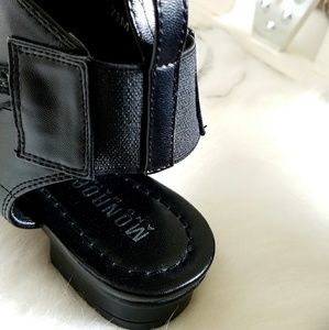 NWOT. Never worn. Unique & stylish black open toe/heel sandals with beaded design around ankle. Very trendy & attention grabbing. Beautiful design on bottom of sandals. Synthetic leather. Size 7.5, true.