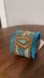 Stunning cuff bracelet with intricate blue and gold beadwork. Features a central turquoise stone and pearl accents.