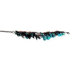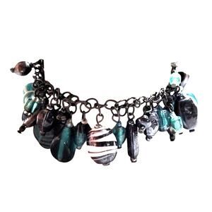 Handcrafted Beaded Bracelet Ankle Adjustable 7"-9" Dangling Glass Charms Teal Aqua Black.