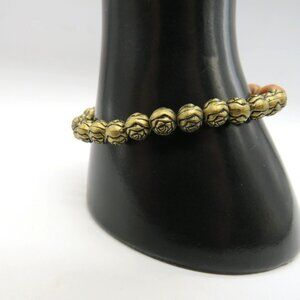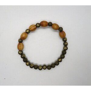 Beaded Bracelet Natural Wood Metal Beads Rose Embellished Brass Tone Stretch