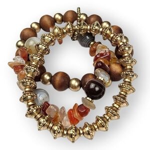 Set of 3 beaded stretch bracelets with antiqued gold tone metal, glass and natural stone chips (including carnelian), and round wood beads