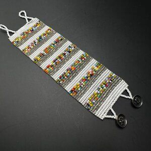 Beaded Bracelet Wide Cuff Multicolor Seed Beads White Silver Tone 925 Clasp 7.5"