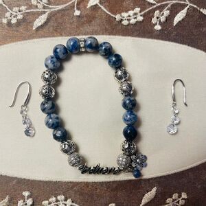 Bundle of two elegant and pretty bracelet and earring sets. One set has Green, Gray, Tan, and Gold beads with a “Love” heart shaped charm, and the other set has Blue, Gray, and Silver beads with a “Believe” charm. Perfect for adding a touch of sophistication to any outfit. Great birthday or Holiday present, or a special treat for yourself! Bracelet have a 6.25" circumference and the dangling earrings are 1.125" long.