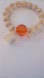 Stylish hand crafted stretch beaded bracelet featuring an orange glass accent bead. Smaller wooded cream/tan colored beads with clear beads. Perfect for any occasion.