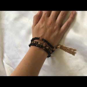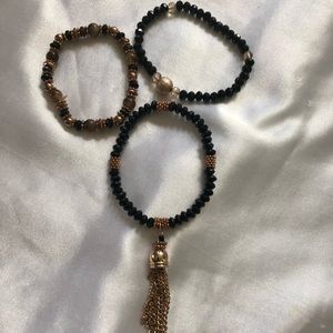 Three beaded bracelets are primarily black and gold. One bracelet has brownish beads and one has a beautiful gold chain tassel.