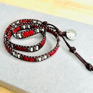 Beaded Brown Leather Cord Red and White Wrap Bracelet