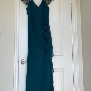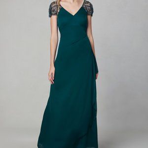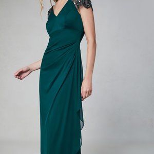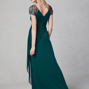 Beaded cap sleeves and faux wrap styling elevate this long dress by Xscape.