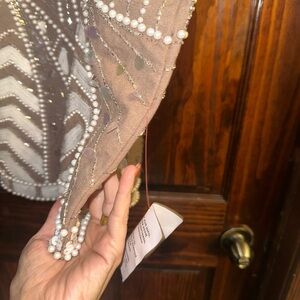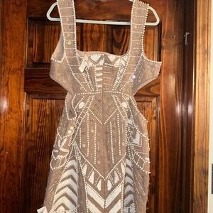 Elegant dress with a beaded chevron pattern. Features white and cream beads on a tan fabric.