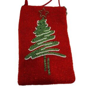 This festive club bag captures the holiday spirit with its intricate beaded Christmas tree design. Crafted for practicality and charm, it features a vibrant red base adorned with green and white beadwork. Ideal for carrying essentials, its strap and snap closure ensure secure and stylish use. Measures about 6.5" long, 4.25" wide. Crossbody strap drop 23". Hand strap drop 3.25".