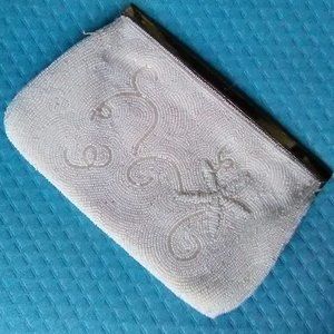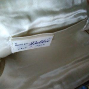 Vintage "Bags by Debbie" hand-sewn white beaded clutch...Starfish pattern...5.5" x 8"...Mother of Pearl clasp...gold-tone trim...white satin pocketed interior...clasp snaps closed by slightly askew...used condition...Made in Japan.