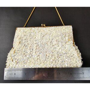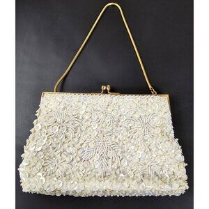 Beaded Clutch Purse Evening Bag Hand Made in Hong Kong MCM Sequin Ivory 7"x4.5"