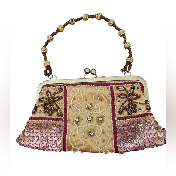This elegant beaded handbag features a stunning cream and pink design, perfect for adding a touch of glamour to any outfit. The intricate beadwork and unique handle make it a standout accessory.