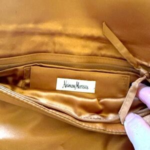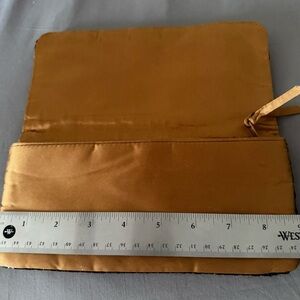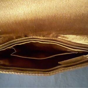 The Iridescent Beaded Clutch Purse by Neiman Marcus is a stylish and elegant accessory perfect for parties or formal occasions. With an animal print design in gold, black, and brown, this rectangular shaped clutch features a zip closure, one interior pocket, and satin interior lining in gold.