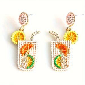 Colorful beaded & rhinestone earrings shaped like cocktails. Features orange, yellow, and green accents. Perfect for a fun, vibrant look.
