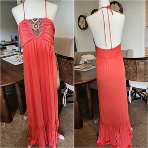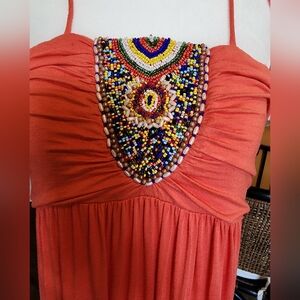 jersey maxi dress by LA designer S twelve- color is really soft and pretty color beads are in good condition- the overall condition of the dress is fair- there is a small hole near the side seam and thin spit on the top side- shown in photo