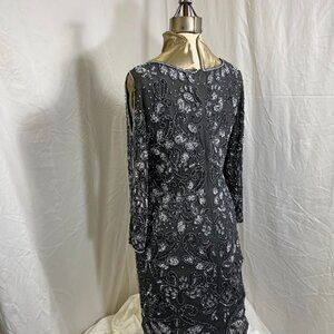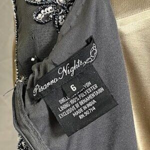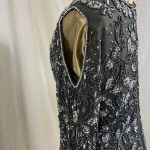 Pisarro Nights size 6 beaded dress in grey, black and pearlescent beads and sequins. The shell is 100% rayon and the lining is 100% polyester. In great condition...just waiting for the next party. 34" long from the back of the neckline to bottom of the hem.
