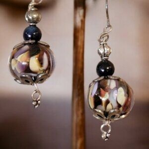 Pretty earrings using lamp work beads and silver backings. They are brown, ivory and black. The earrings are 2 inches in length.