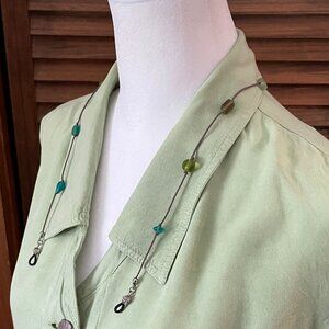 This beaded eyeglass chain, also called a croakie, is made of varied green, blue, and brown opaque beads on a light brown knotted cord. It hangs about a foot around the neck to hold eyeglasses. Elastic loops at each end hold the arms of eyeglasses while the hang around your neck, keeping eyeglasses close at hand for when you need them. The style and colors will complement almost any outfit.