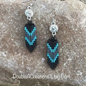 Beaded Feather Earrings in Turquoise Gray and Black, New, Handmade by Me