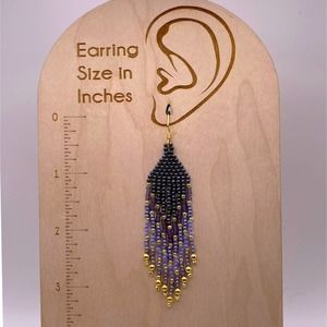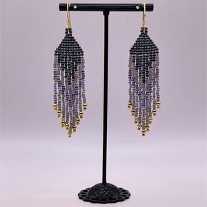 Beaded Fringe Dangle Earrings Purple Violet Lavender Gold Glass Beads Beadwork
