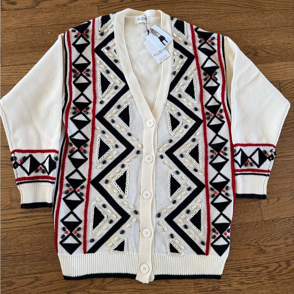 Stylish cardigan with geometric patterns. Features black, red, and cream colors. Beads and embroidery- size med- true to size brand new with tags