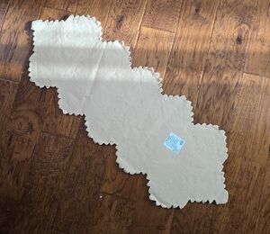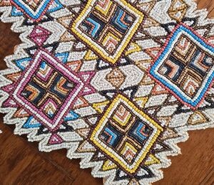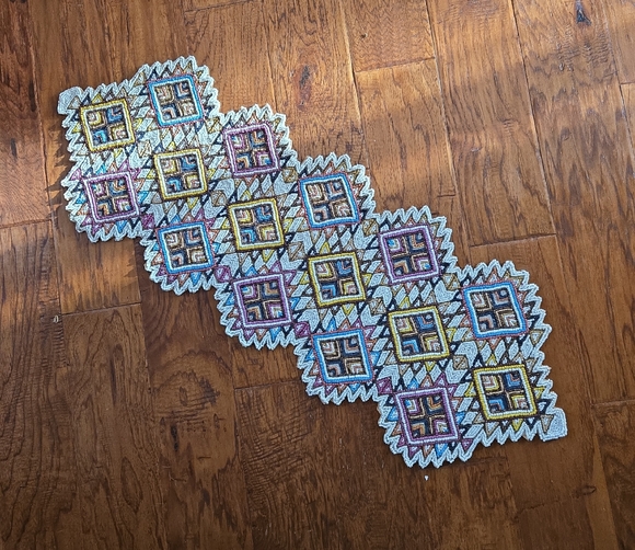 Beaded table runner with geometric patterns. Features blue, yellow, pink, and white and brown beads.
