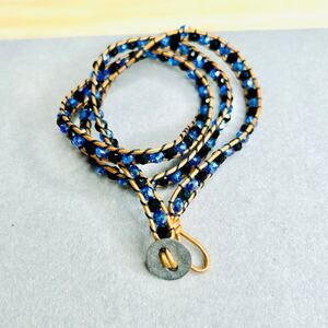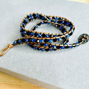 Beaded Gold Cord Leather Blue and Black Beads Wrap Bracelet