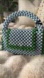 Chic and stylish beaded handbag in blue and green. Perfect for adding a pop of color to any outfit.