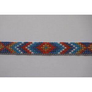 Hat Band is hand beaded using a loom. Made with blue, orange, teal, white, and gold colored Czech glass beads.