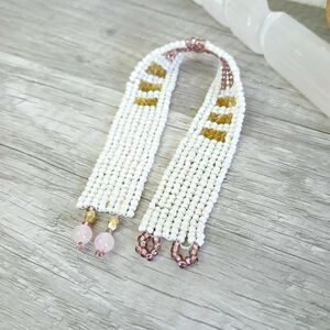 Glass seed beads in white, gold, & pink with rose quartz gemstone clasp