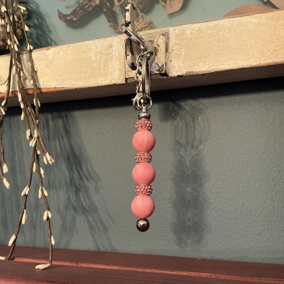 Pink and very sparkly. Measures 5.5”. Has additional claw clasp for extra charms.
