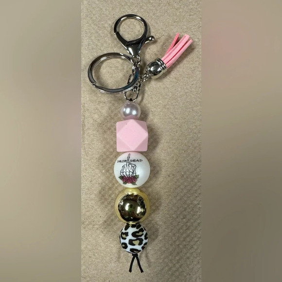 NEW✨ Silicone and acrylic beaded Keychain. Large key ring and lobster clasp. Acrylic bead is a skeleton finger that says ‘drop dead’.
