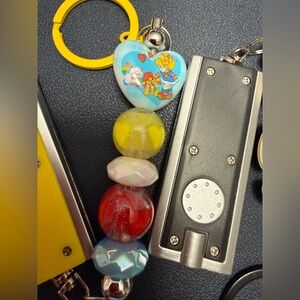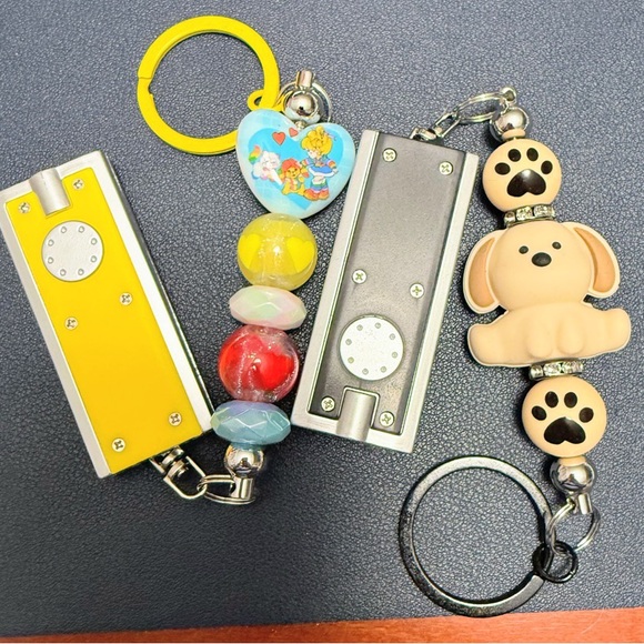 Cute and brand new beaded led flashlights! Perfect for bags, unlocking things in the dark, or when walking your pet at night! Choose from the yellow flashlight that features glitter heart beads and a rainbow bright heart, or the black flashlight with paw prints and a silicone pup! Prefer different colors! Different beads? Let me know!